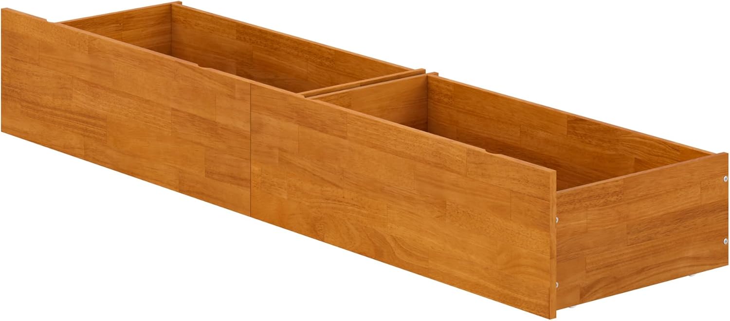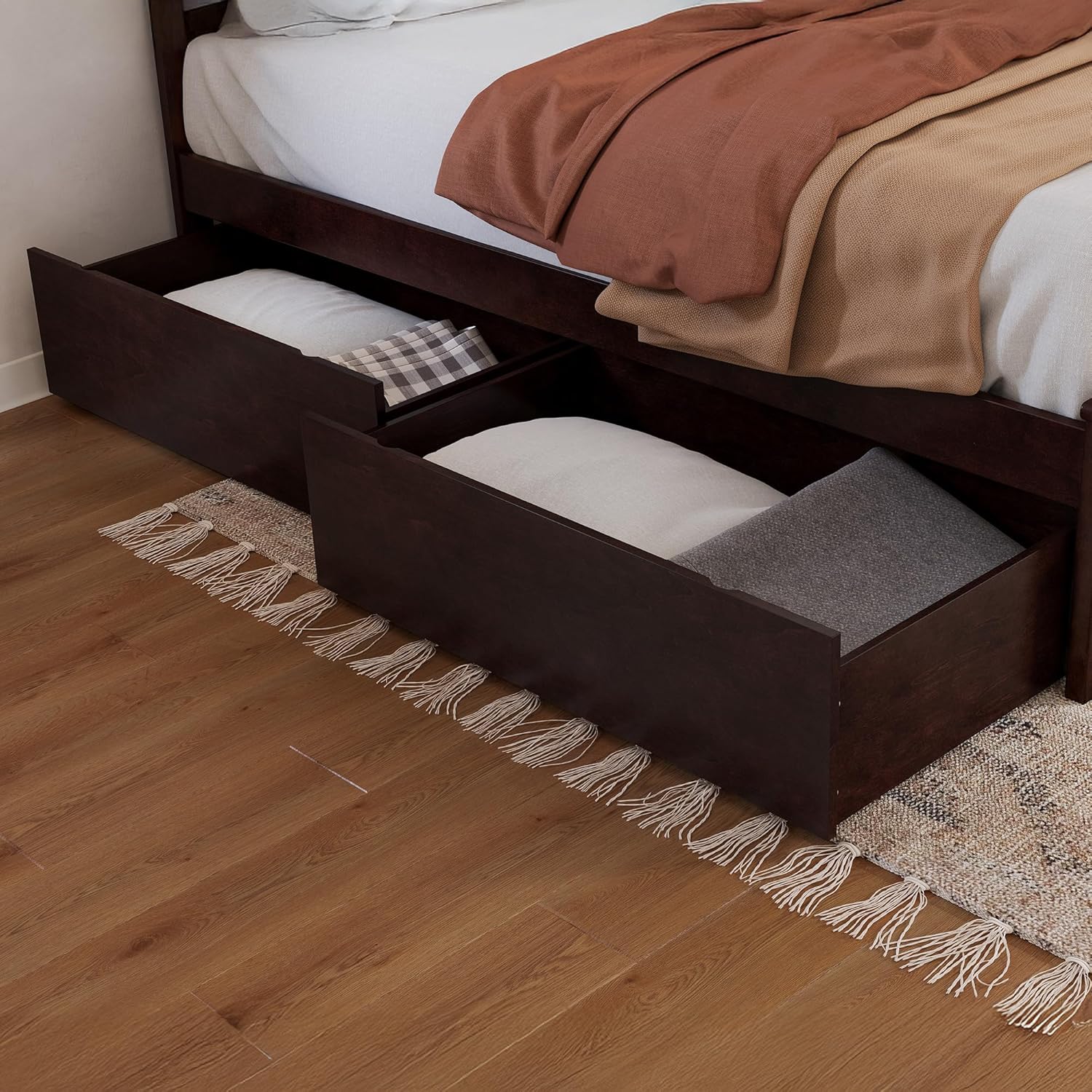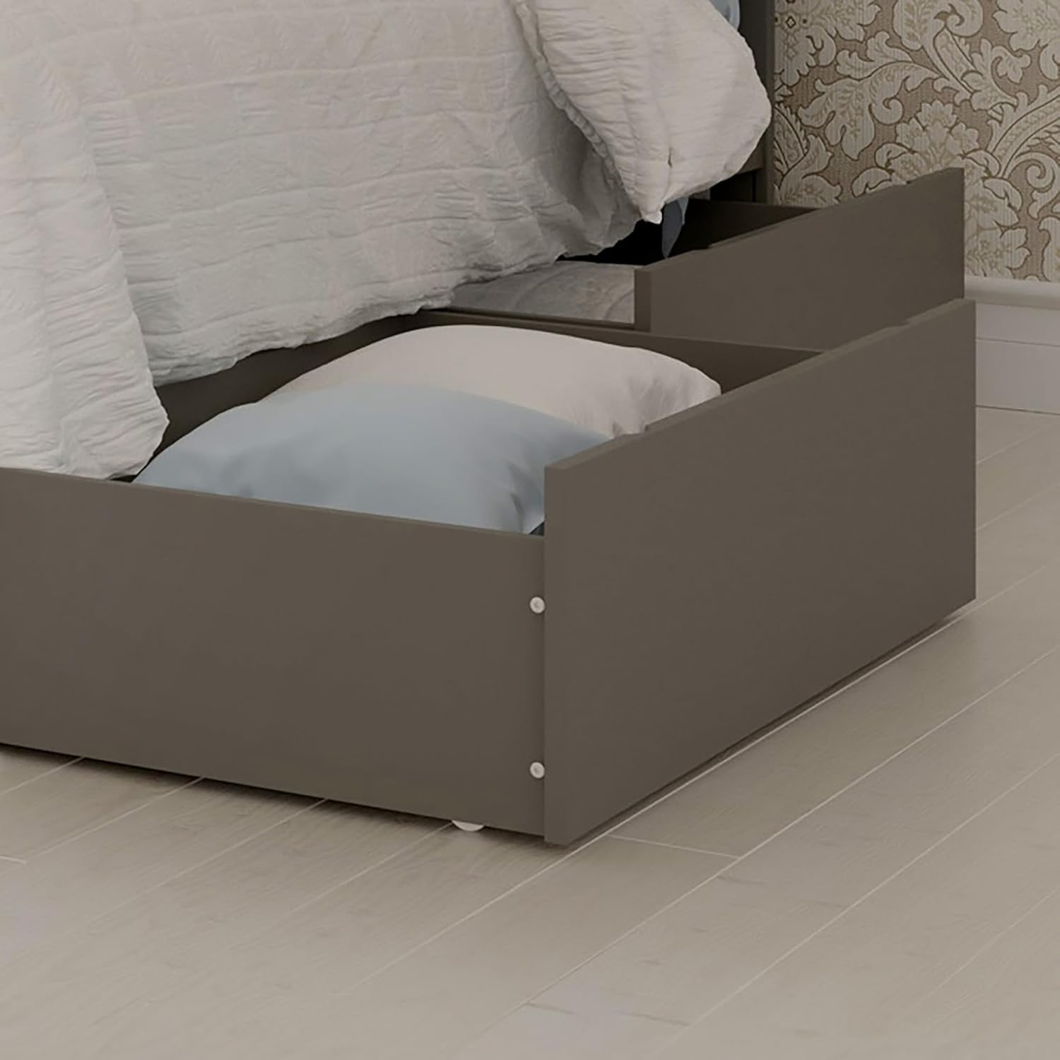 Modern storage made effortless. With clean lines and a streamlined silhouette, these wood under-bed Storage Drawers are a sleek storage solution designed to complement any bedroom. Crafted for convenience, each set includes two spacious drawers that glide smoothly on independent, non-marking rollers, making them ideal for both hardwood and carpeted floors. Designed for compatibility with bed frames that have a minimum under-bed clearance of 12 inches, the drawers can be positioned on either side of a bed for discreet, easy-access storage. Available in two sizes: Twin/Full and Queen/King/Twin XL, and a selection of versatile colors, including Espresso, White, Walnut, Grey, and Light Toffee to simplify and elevate your space.