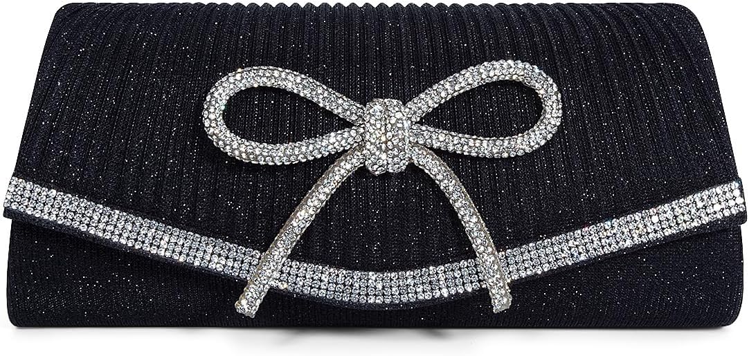 Crafted from shimmering textured fabric with high quality polyester lining, this clutch bag is lightweight and durable. The rhinestone bow, gltter material make it fashion and charming. The clutch purses for women design with a main compartment and a inner slip pocket which can holds cellphone, perfume, cosmetics and cards well, its detachable strap provide various carry-on option, you can use this small purse as clutch bag, crossbody bag or shoulder handbag. This black evening bag combines practicality and aesthetic, it can not only for lady using as formal purse but also a daily handbag for friend and yourself on any special occasions, like birthday, party, Christmas and anniversary.