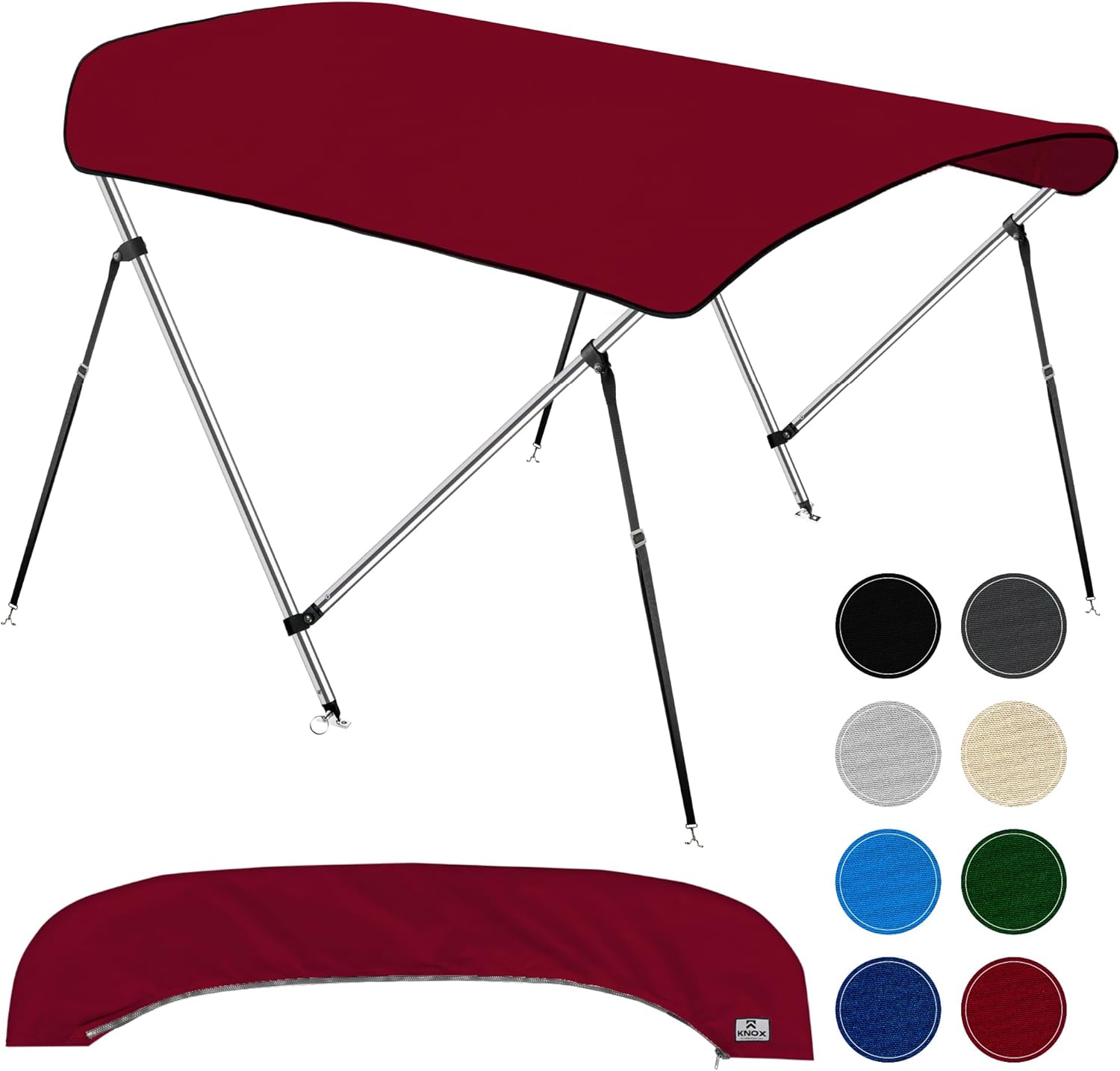 Features: [SUPERIOR SHADE FOR SMALL BOATS] - Look no more with KNOX's superior 2 bow boat canopy Bimini kits. Designed to provide full shade coverage for boats within 3.2–4.5 feet wide. This includes aluminum jon boats, V-Hulls, bass boats, inflatable row boats, dinghies and runabouts.[PREMIUM STAINLESS STEEL HARDWARE] - Our 2 bow Bimini top for boat kits comprise of robust double-walled 1 inch aluminum Bimini top support poles and stainless steel canvas mounting hardware. Our kits also include adjustable straps with stainless steel hooks.[MOUNTS ON INFLATABLE & ALUMINUM BOATS] - Option 1: Install our rubber base mounts to your inflatable fishing boat using the PVC canopy glue in our sun shade pole kit, and insert the rods into the base. Option 2: Drill our deck mounts and saddles onto your row boats aluminum sides with self-tapping screws. Insert the boat awning poles into the deck mounts and secure with quick release pins.[NEVER FADES] - The boat cover material of our 2 bow boat canopy Bimini canvas is solution-dyed for high colorfastness.[INCLUDES ZIP-ON BIMINI TOP BOOT] - A matching colored Bimini cover boot is included with our 2-bow folding Bimini top cover. This allows for easy and compact storage of the paddle boat cover when not in use.Specifications: Canvas Material: 900D Oxford Polyester Frame Material: Double-Walled Aluminum Tubes Bow Type: 2-Bow Size: 63" L x 43" H x 39"-55" W Brand: KNOX Color: Pacific Blue Condition: 100% Brand New Package Includes:1x 2-Bow Frame Kit1x Bimini Top Canvas1x Zippered Boot1x Mounting Hardware1x Installation Manual