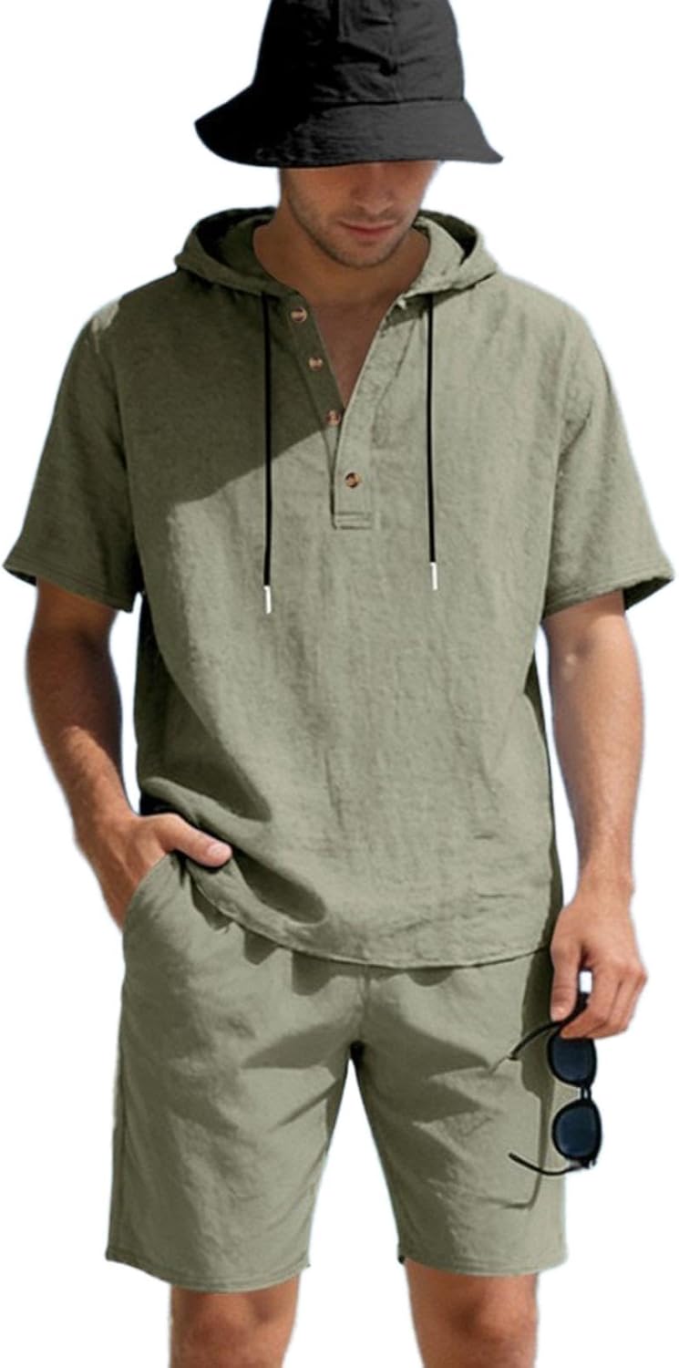 Men's Casual Outfits 2 Piece Sets Summer Linen Short Sleeve Button Down Shirt and Shorts