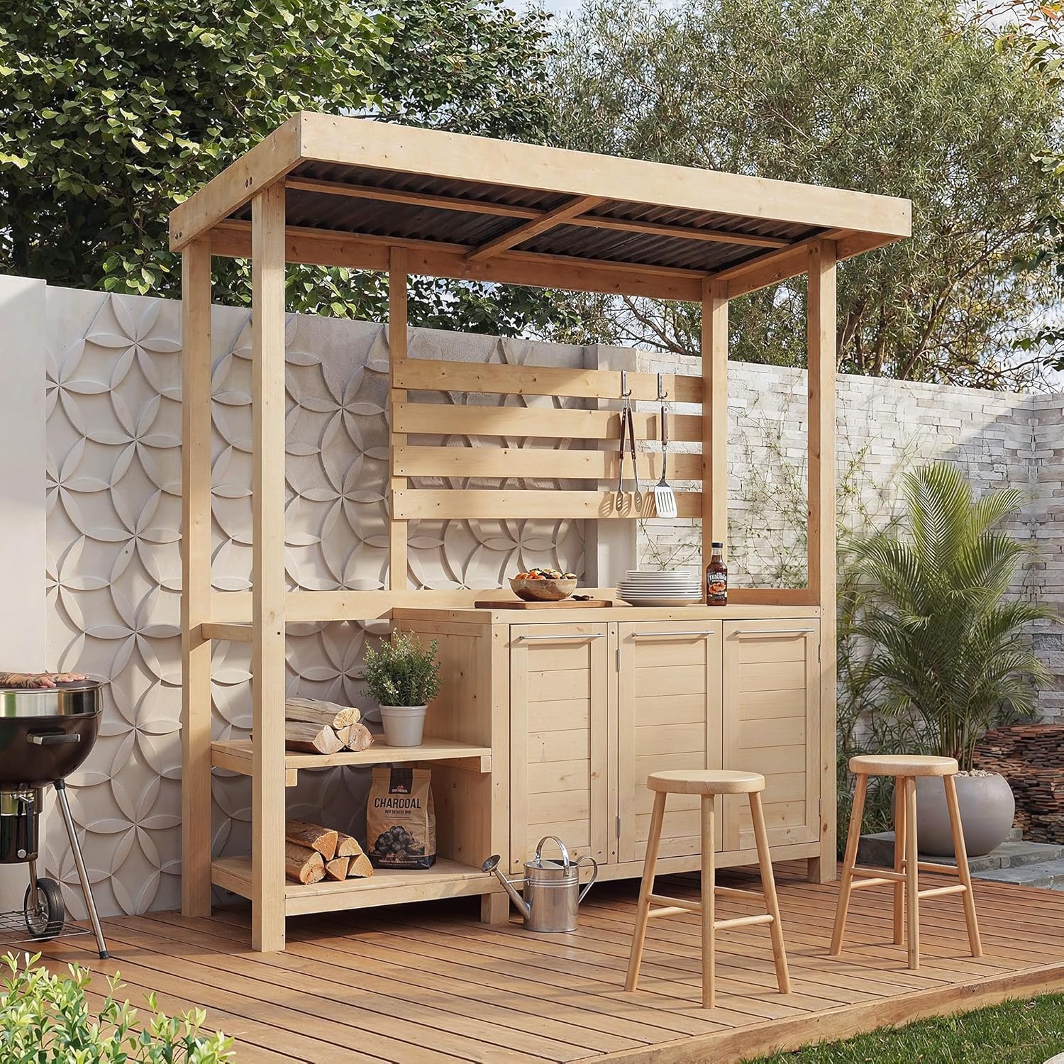 MOUMON 7FT Grill Gazebo with TV Mount, Cedar Wood Bar Gazebo Outdoor Bar Set with PVC Roof, Dual Countertop, Shelves, Patio Entertain Center Shade Pavilion for Backyard Garden Poolside Beige