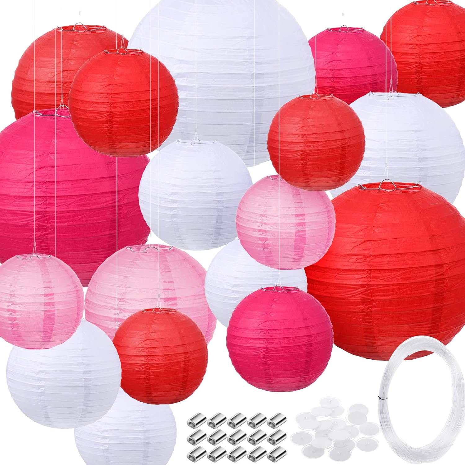 Sufficient quantity: 18 pieces round paper lantern, 1 roll 20 meters fishing line with 40 pieces aluminum crimping loop sleeve and 20 pieces wall hanger; The paper lantern can serve as an elegant background to be hung in the room, and they can also be applied as gorgeous outdoor party decorations