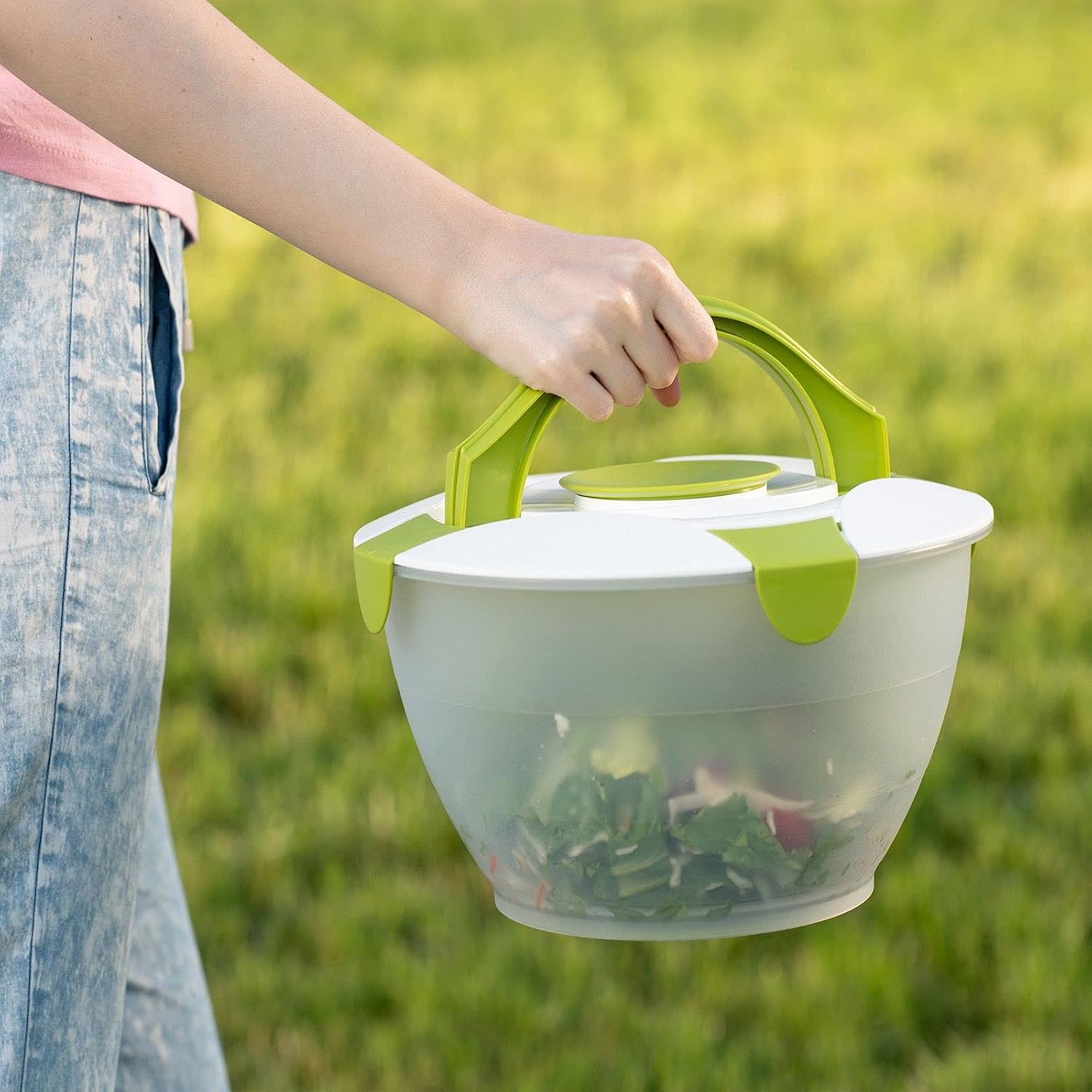 Multifunctional salad bowl "Praktika" with lid, integrated handles and dressing container, for keeping salad, serving and transporting salad, filling volume bowl: 6.5 l, filling volume dressing container: 0.3 l - Large "Mixery" dressing shaker (0.5 l) with removable mixing disc, measuring scale and pouring spout in the lid for easy preparation, transport and storage of salt. AT-dressingingssSauces, cocktails, baby food etc. - 2-piece, modern "Bubbles" salad servers with decorative air bubbles in the handles and extraordinary design for easy preparation and serving of salads - Made in Germany, easy cleaning, dishwasher safe, BPA-free - Box contents: 1x Westmark salad butler, salad servers and dressing shaker set, 3 pieces, material: plastic (SAN/PP/PE), colour: transparent/white/green, 2422222 EE7